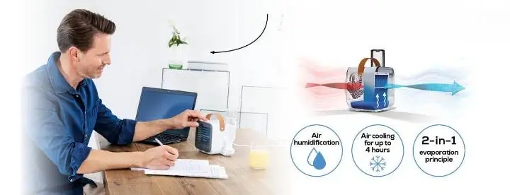 - באמצעות מאוורר מובנה ועקרון אידוי המים עם ידית הנשיאה המחוברת המסודרת, אתם יכולים לשמור את המכשיר הקומפקטי הזה לצידך כל הקיץ.