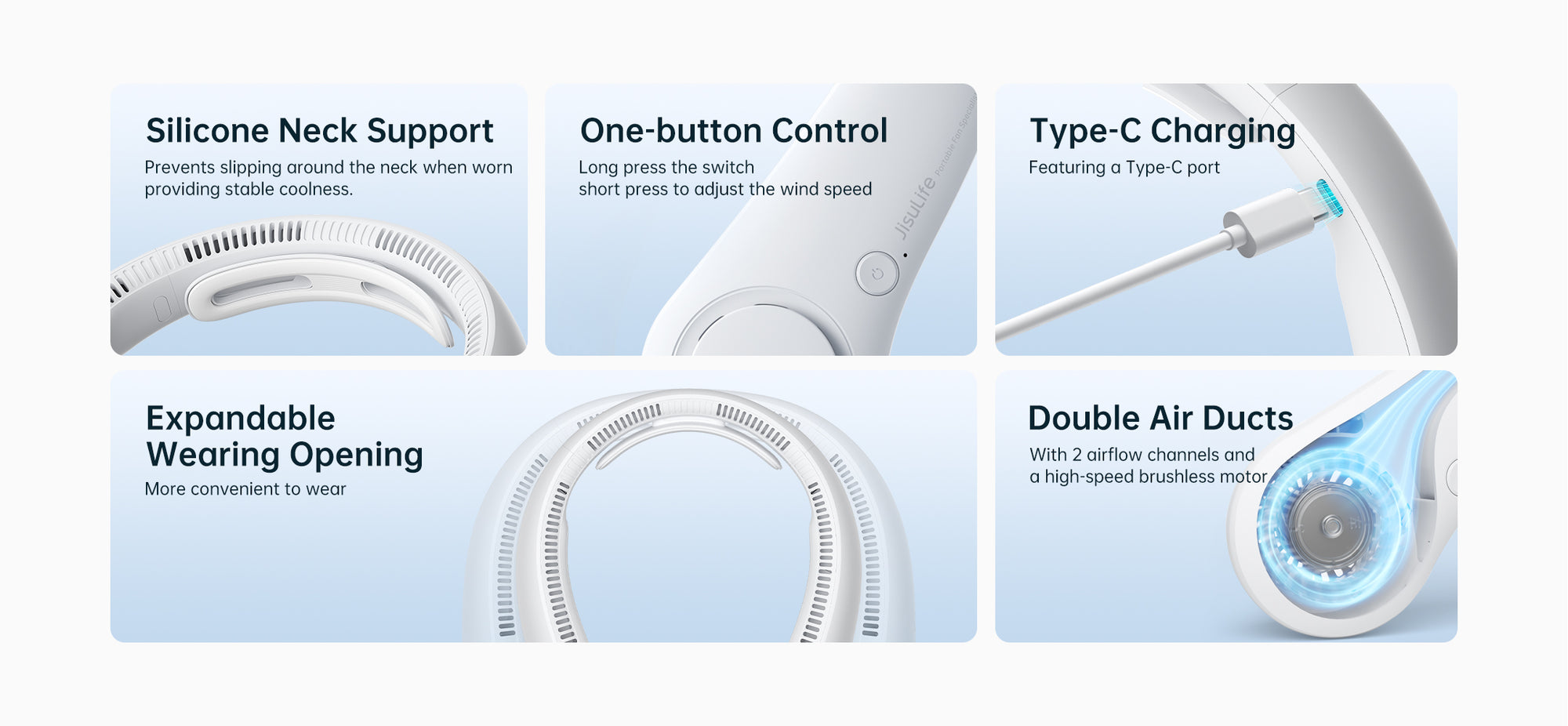 עם עיצוב ארגונומי ונוח המתלבש סביב הצוואר, תוכלו ליהנות מקירור אישי ללא ידיים, בכל זמן ובכל מקום. טכנולוגיית זרימת אוויר מתקדמת מבטיחה קירור שקט ואפקטיבי