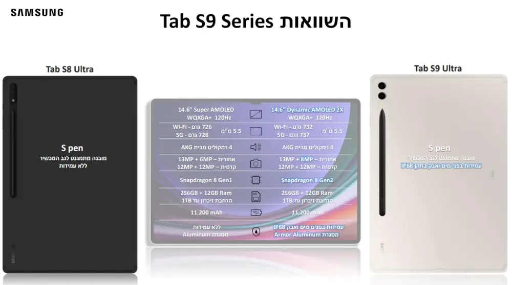הכירו את ה-Galaxy Tab S9 Ultra 5G מבית Samsung בעל מעבד Snapdragon 8 Gen2, מסך "14.6 Dynamic AMOLED 2X, זכרון בנפח 12GB, אחסון בנפח 256GB, מצלמות אחוריות 13MP + 8MP ומצלמות קדמיות 12MP + 12MP, סוללה בנפח 10,900mAh שיתוף טעינה אלחוטי וכולל S Pen.