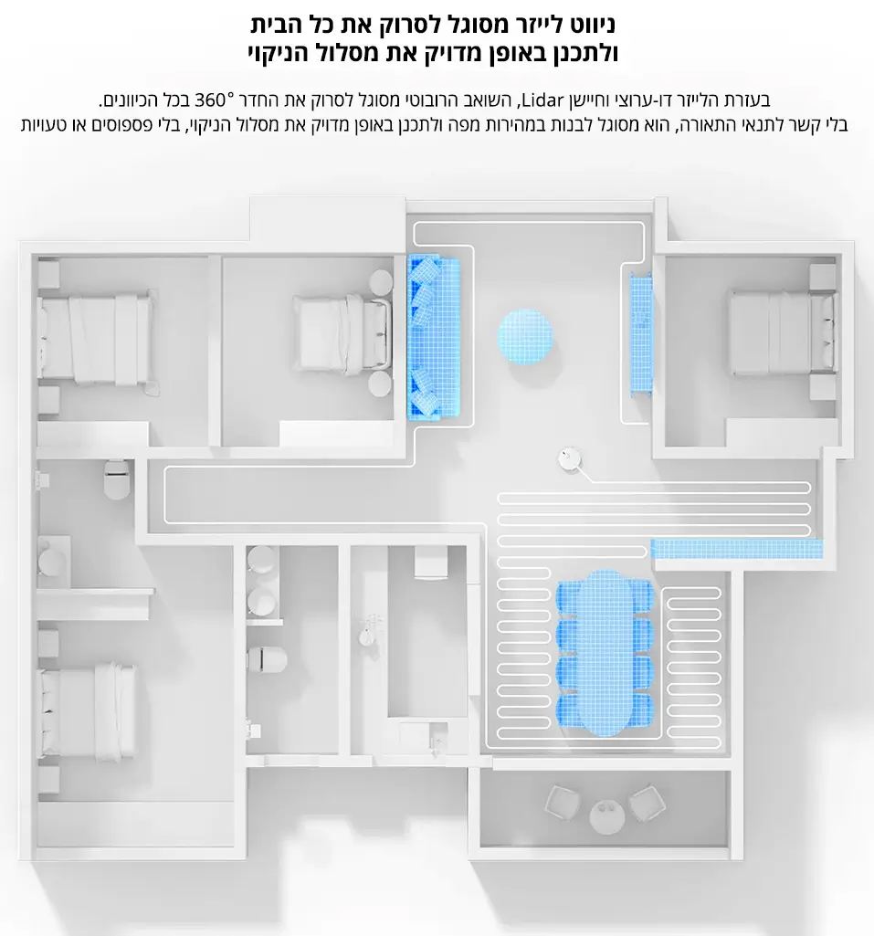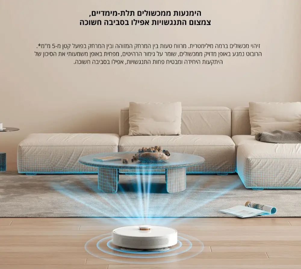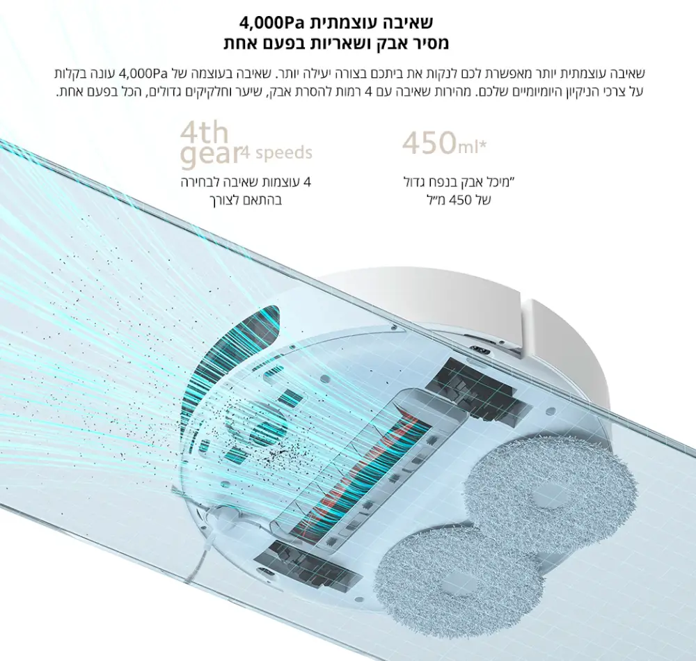 מערכת תלת-מימדית להימנעות ממכשולים - טכנולוגיית ברמה מילימטרית להימנעות תלת-מימדית ממכשולים, מערכת ניקוי וניגוב משופרת - זיהוי שטיחים מתקדם, עוצמת שאיבה אדירה של 4000Pa - מנוע שאיבה עוצמתי הניתן להפעלה ב-4 מהירויות שונות לכל יישום וצורך: שקט, רגיל, חזק וטורבו.